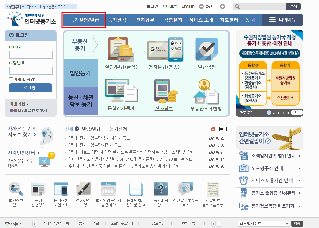 등기부등본 열람하기를 클릭한 후 등기부등본을 열람합니다.